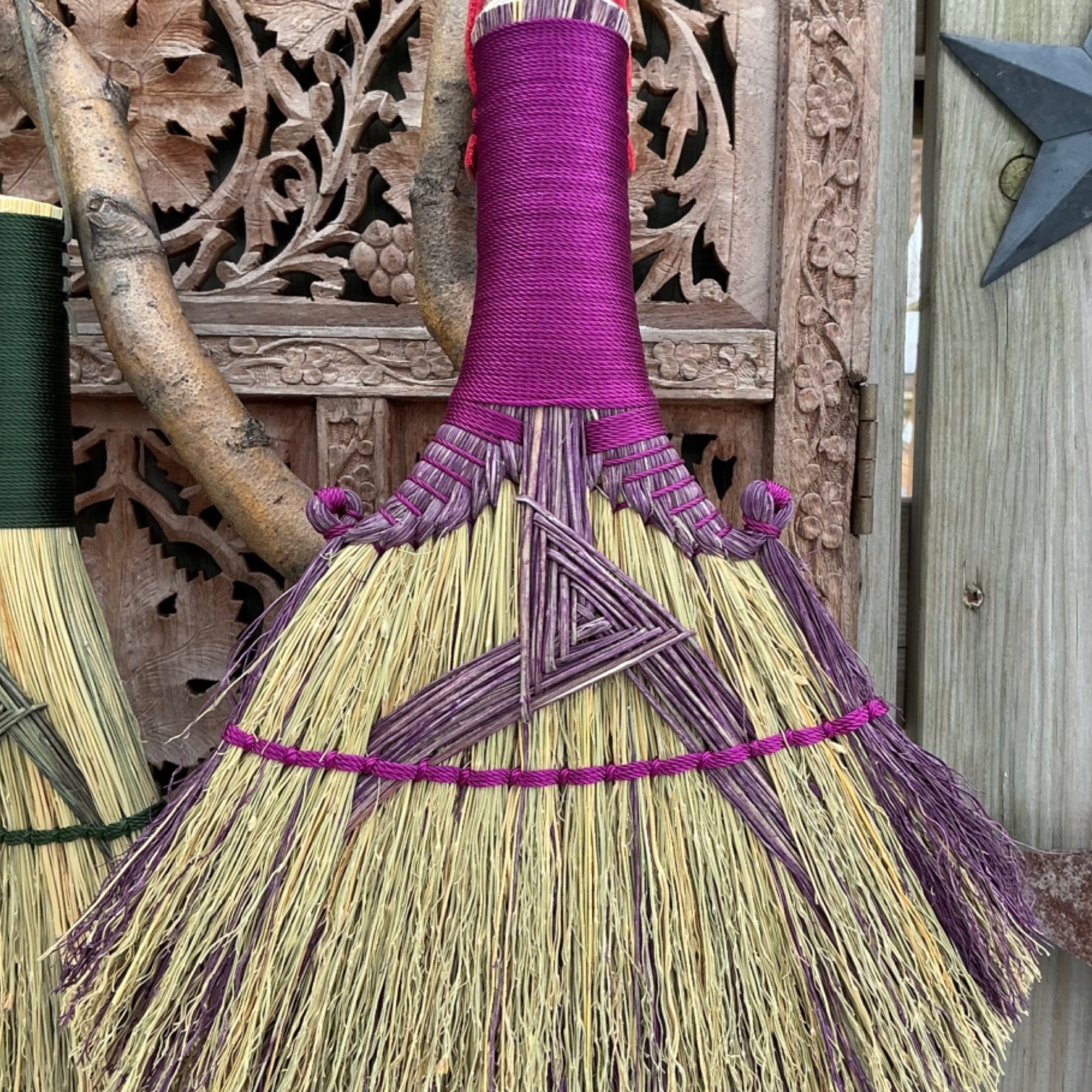 This sweet hand broom speaks to this time of year and the lambing season. The shape that the double rooster tails create reminds me of a rams head. This hand broom is a work of art, with its purple broomcorn and its hyacinth purple cord, as well as a purple three legged Brigid’s Cross. This hand broom also has a purple cord chonky handle, which feels solid and so good in the hand. The hanging loop is red, a nod to the fire element of Imbolc.