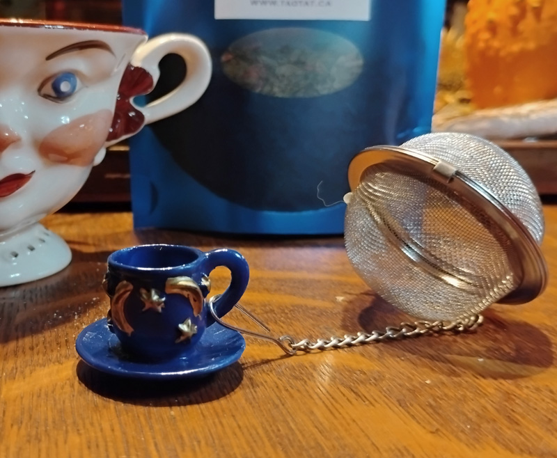 The sweetest little cobalt blue or scarlet red cup and saucer with gold moons and stars. Made of resin and super tough, on a stainless steel chain with a 2” single cup infuser to make a perfectly mystical cuppa tea! (Sorry, the tea mug is for display only, not for sale!)