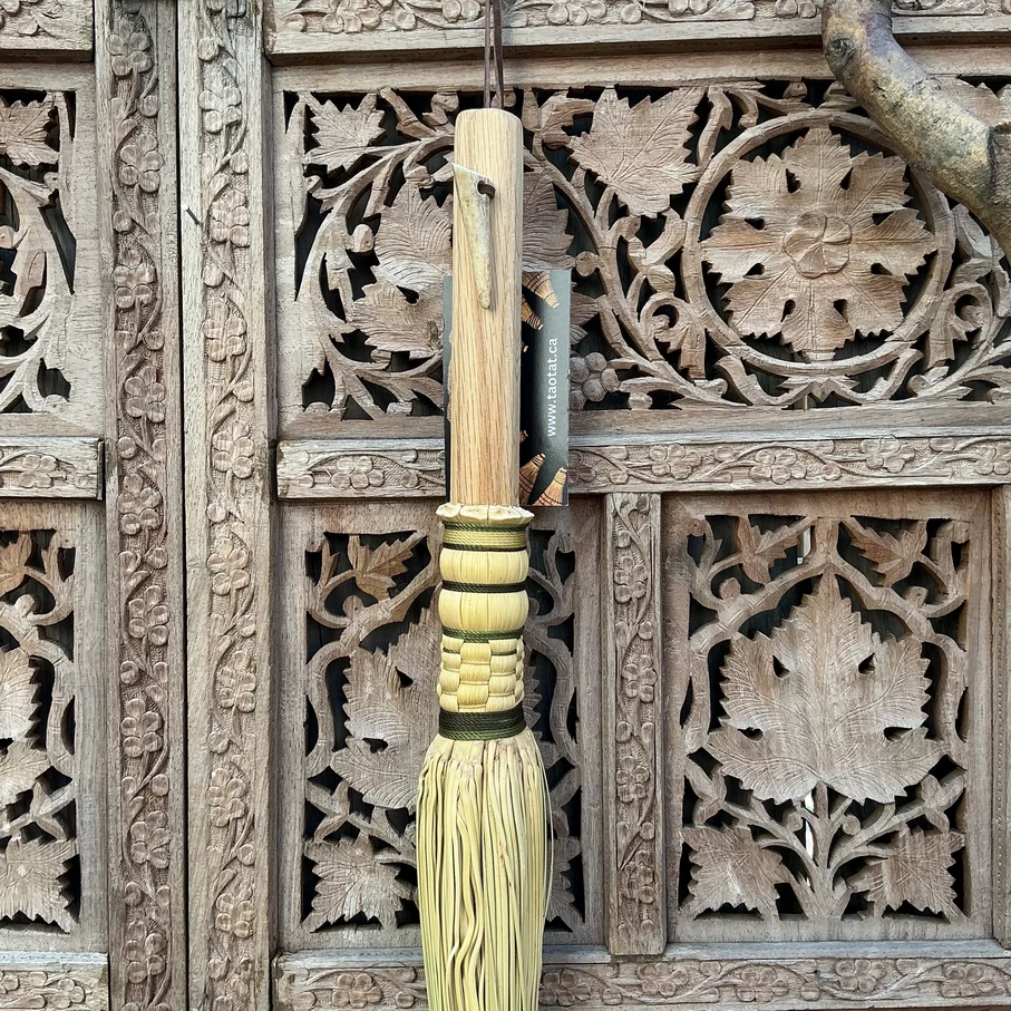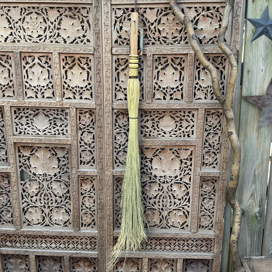 A perfect tool for reaching heights (or under furniture) to get those areas we don’t always think about when we clean our homes. A cobweb broom becomes an extension of your arm to reach the corners of your ceilings, or underneath furniture to fish out pet or children’s toys. Tied onto a black oak, square hewn handle with variegated forest green cord, and has an antler tip toggle for its hanging loop.