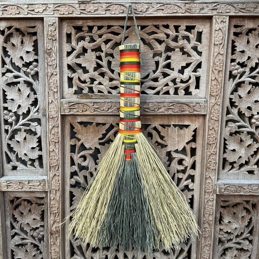 This hawk tail broom is tied onto natural and sage green broomcorn, with the most perfect harvest coloured cord. This brooms is 12.5 inches long, and with a 8.25 inch wide bristle.
